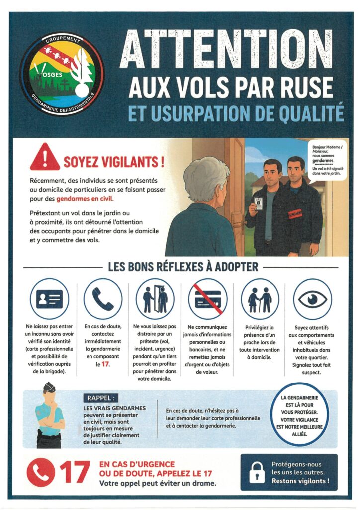 Récemment des individus se sont présentés au domicile de particuliers en se faisant passer pour des gendarmes en civil, prétextant un vol dans leur jardin afin de détourner l’attention et commettre des vols.